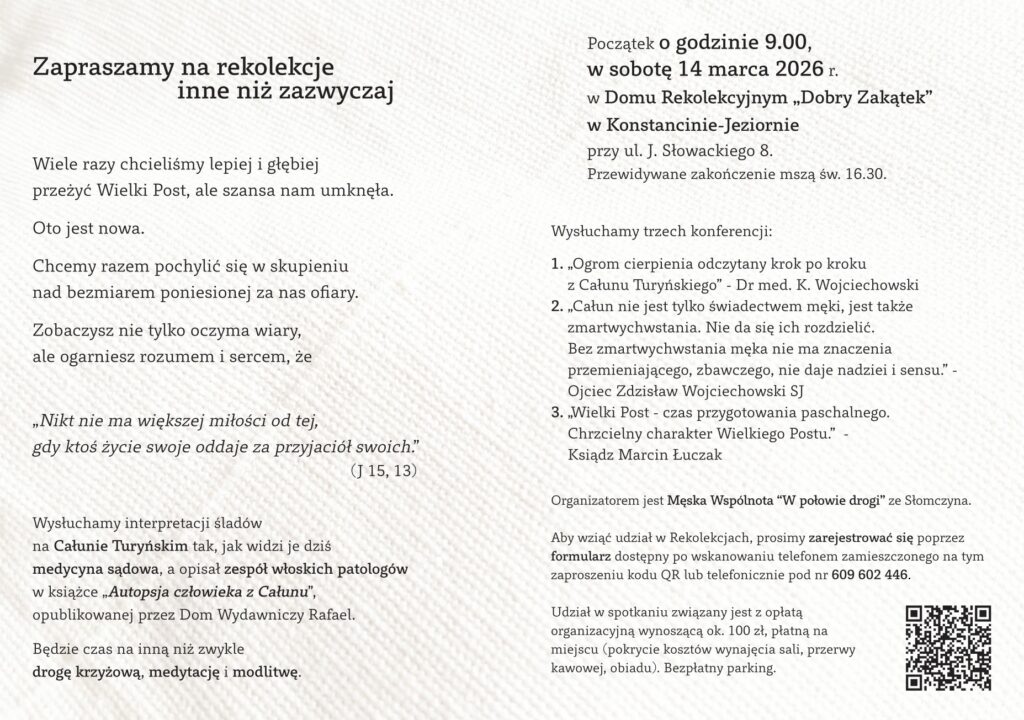 Męska wspólnota „W Połowie Drogi” przy Parafii rzymskokatolickiej Św. Zygmunta w Słomczynie, zaprasza na męski dzień refleksji i modlitwy w dniu 14.03.2026 (sobota), który odbędzie się w godz. 9:00 – 16:00 w Domu Rekolekcyjnym – Dobry Zakątek w Konstancinie-Jeziornie (ul. Słowackiego 8, wskazówki dojazdu –> https://maps.app.goo.gl/QHcRduimX4AETKY19)